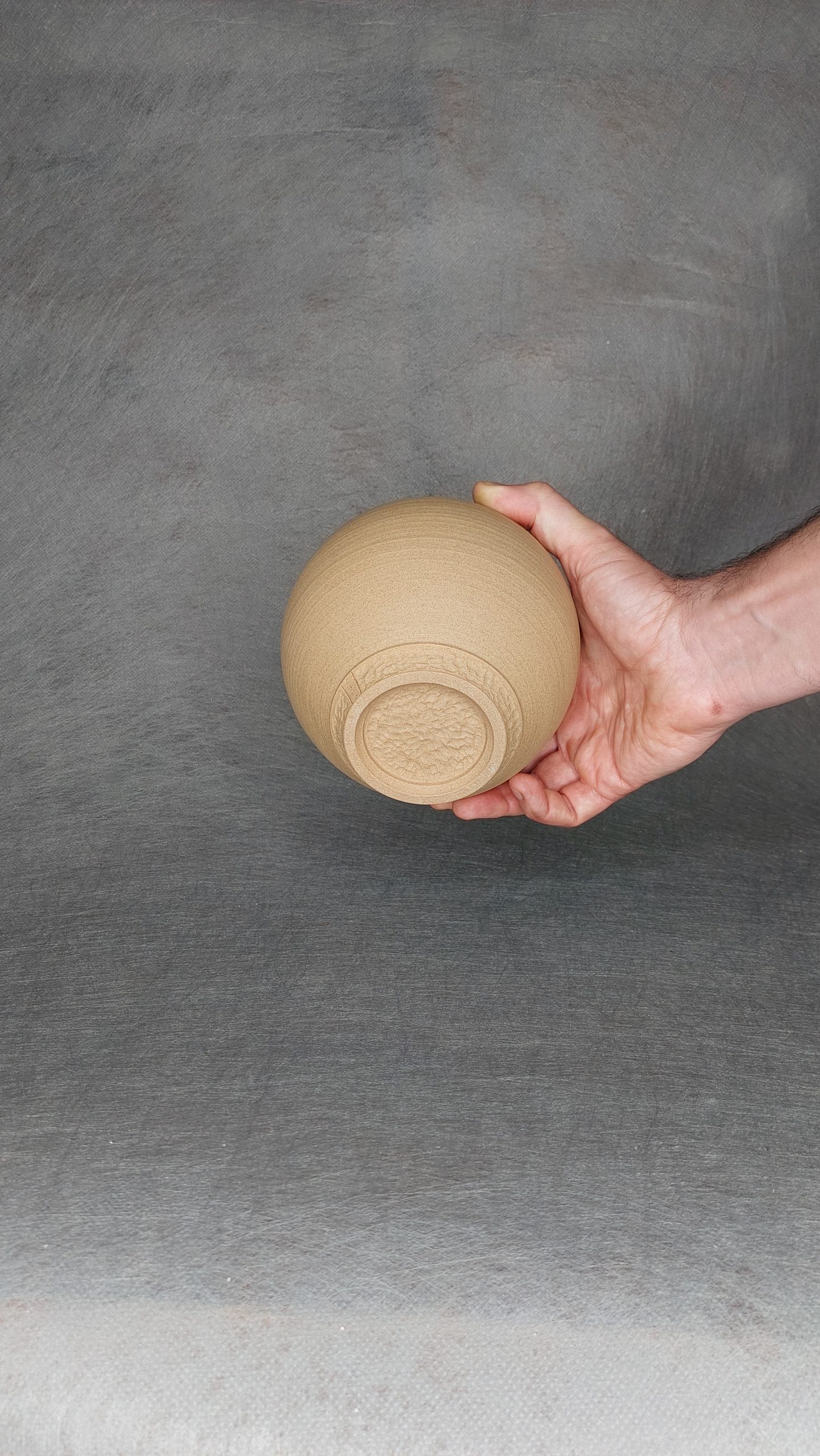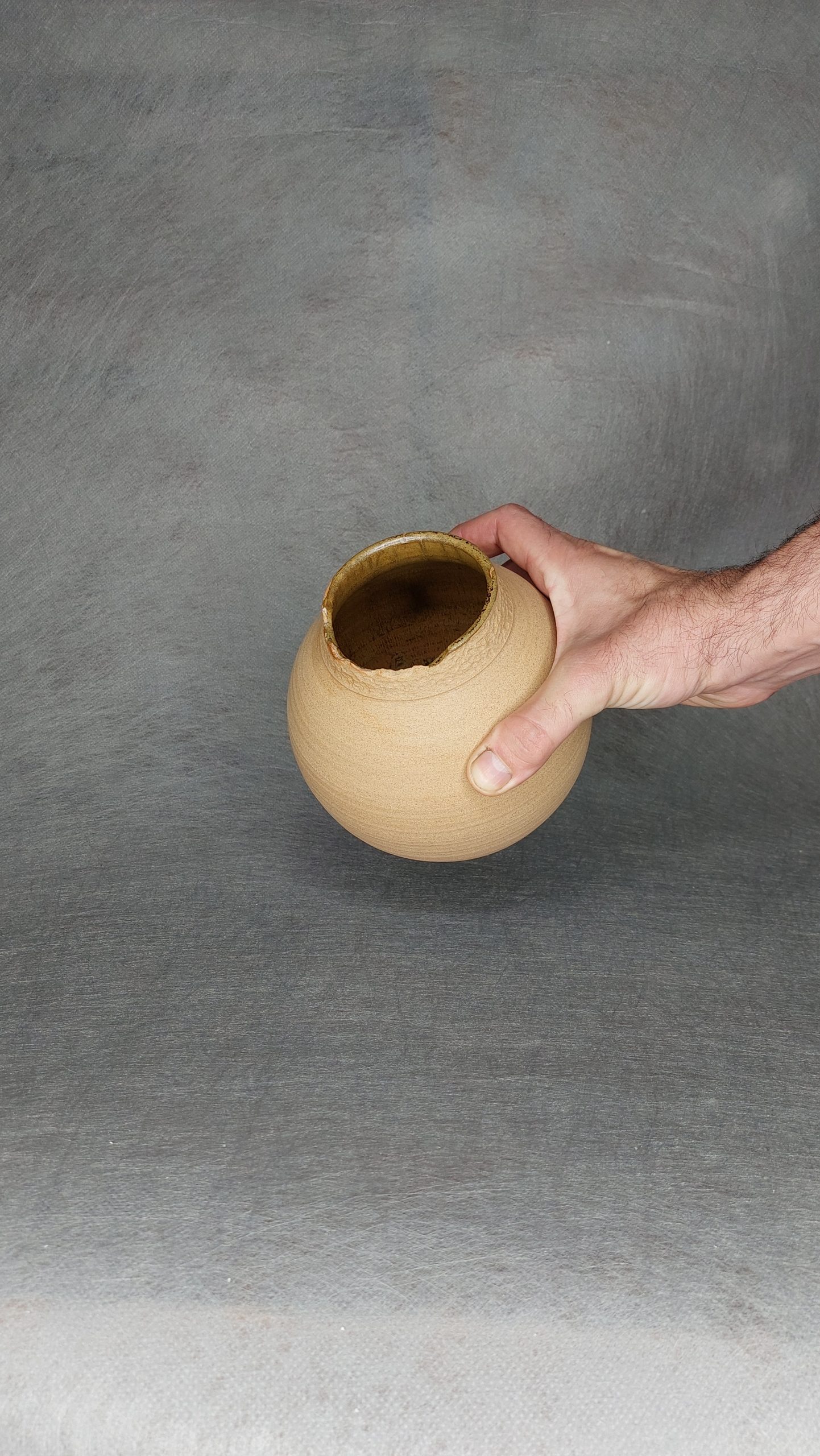 Vase fabriqué en grès de treigny, émaillé d’un doré brillant, avec une base et un pied texturés lui donnant ainsi une silhouette élégante. L’émail est appliqué avec soin uniquement à l’intérieur du vase et nécessite que votre œil s’y plonge pour en observer tous les détails.